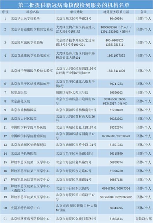 2020年4月15日,北京市公布了46所向團體和個人提供新冠病毒核酸檢測服務(wù)的醫(yī)療衛(wèi)生機構(gòu)。剛剛,北京市衛(wèi)健委公布了第二批面向團體和個人提供新冠病毒核酸檢測服務(wù)的21所醫(yī)療衛(wèi)生機構(gòu)名單。 其中,北京華大醫(yī)學(xué)檢驗所等20所醫(yī)療機構(gòu)面向團體和個人提供新冠病毒核酸檢測服務(wù),北京鐵路疾病預(yù)防控制中心為鐵路系統(tǒng)內(nèi)部提供核酸檢測服務(wù)。目前,北京提供新冠病毒核酸檢測服務(wù)的醫(yī)療衛(wèi)生機構(gòu)共67所。有檢測需求的單位和個人,請?zhí)崆斑M行預(yù)約。